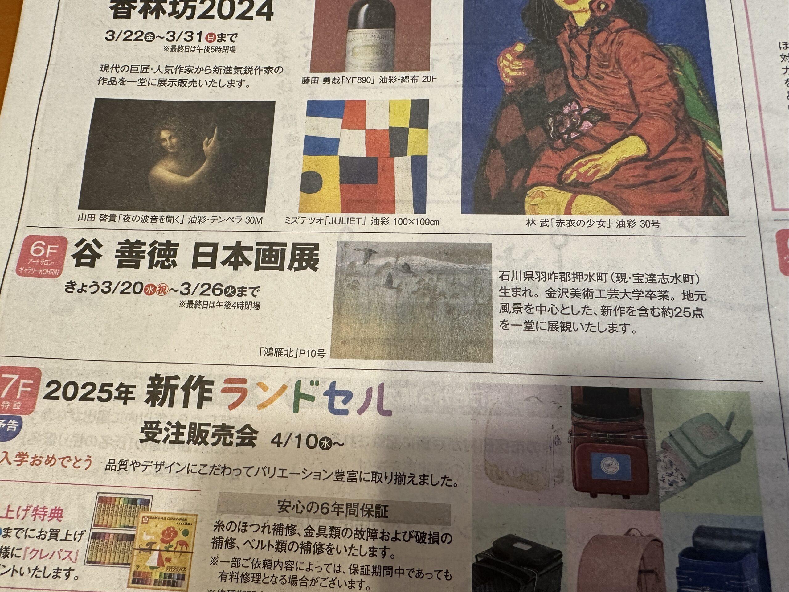 谷 善徳 日本画展 3月20日から26日(火)まで 「精錬されたクールで優しい絵を描かれる画家です」 香林坊大和 スタハ 辰村 &nb …