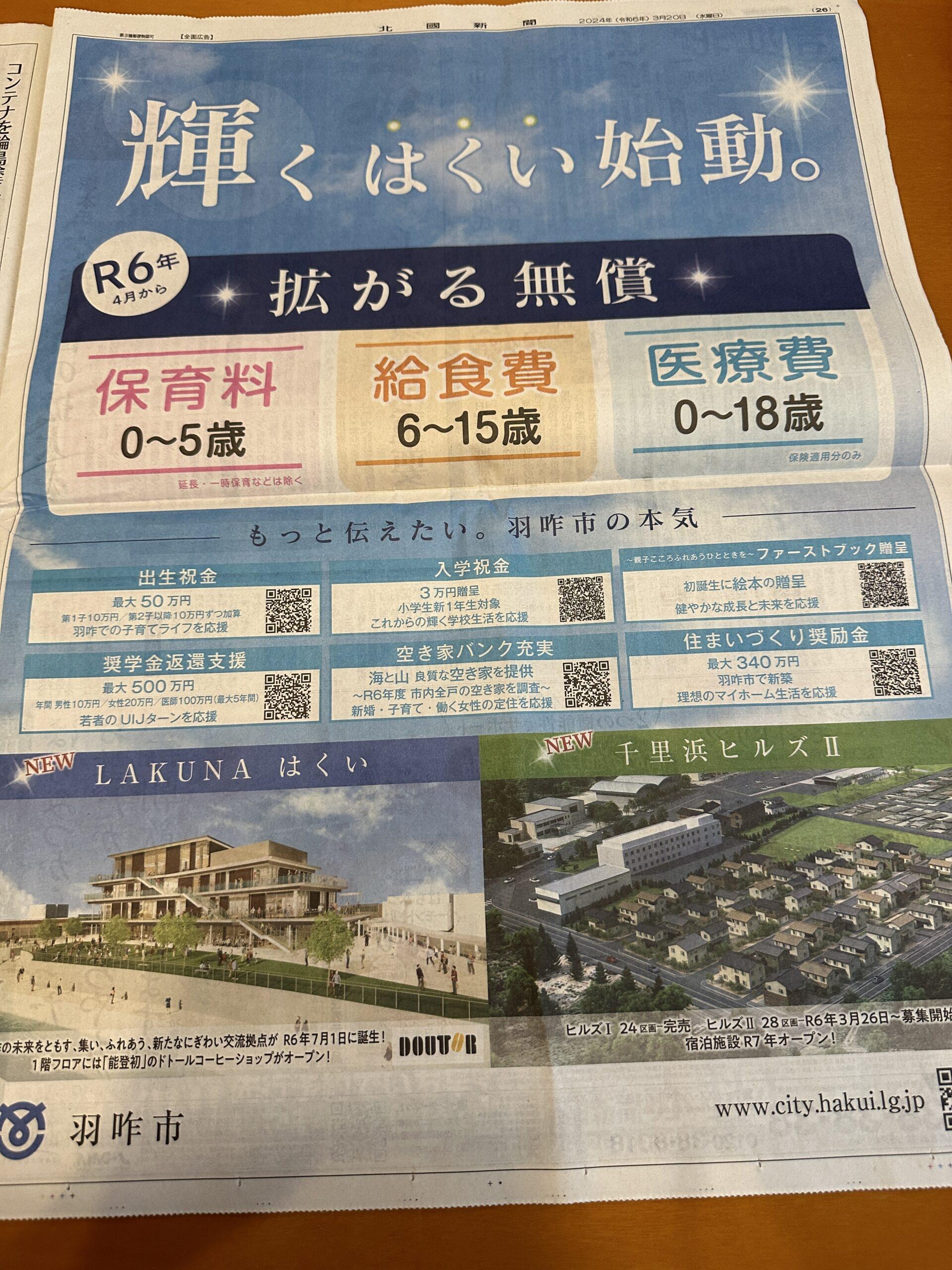 【 羽咋の全面広告(北國) 保育料無償 給食費無償 医療費無償 】コメント (0)