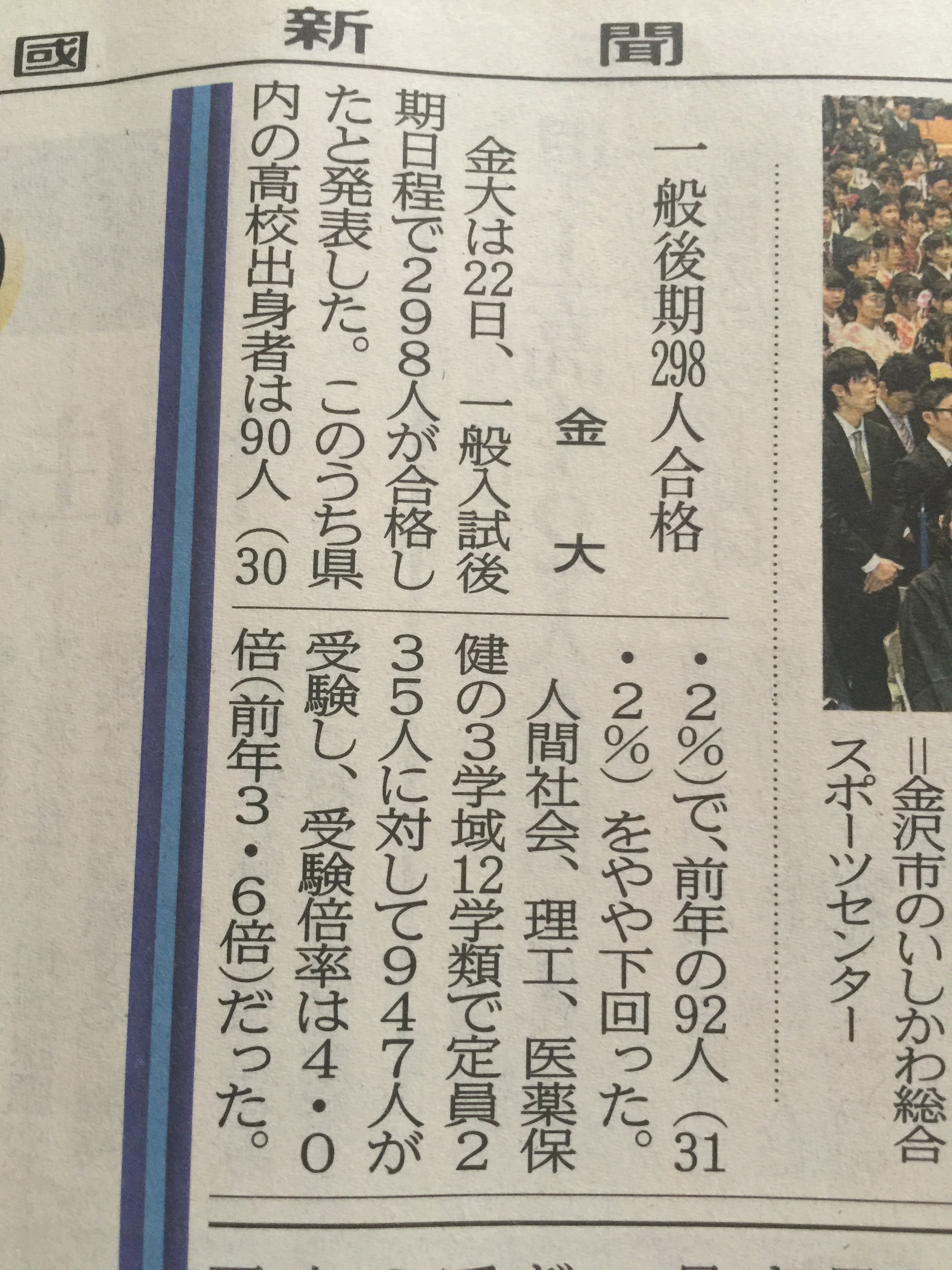 北國新聞より今朝の朝刊。 県内の合格者は 90人。30%。 いつも トータル25パーセント前後が 石川県出身者なので 後期の比率は少し高いということか。 合格したみなさん 本当に …