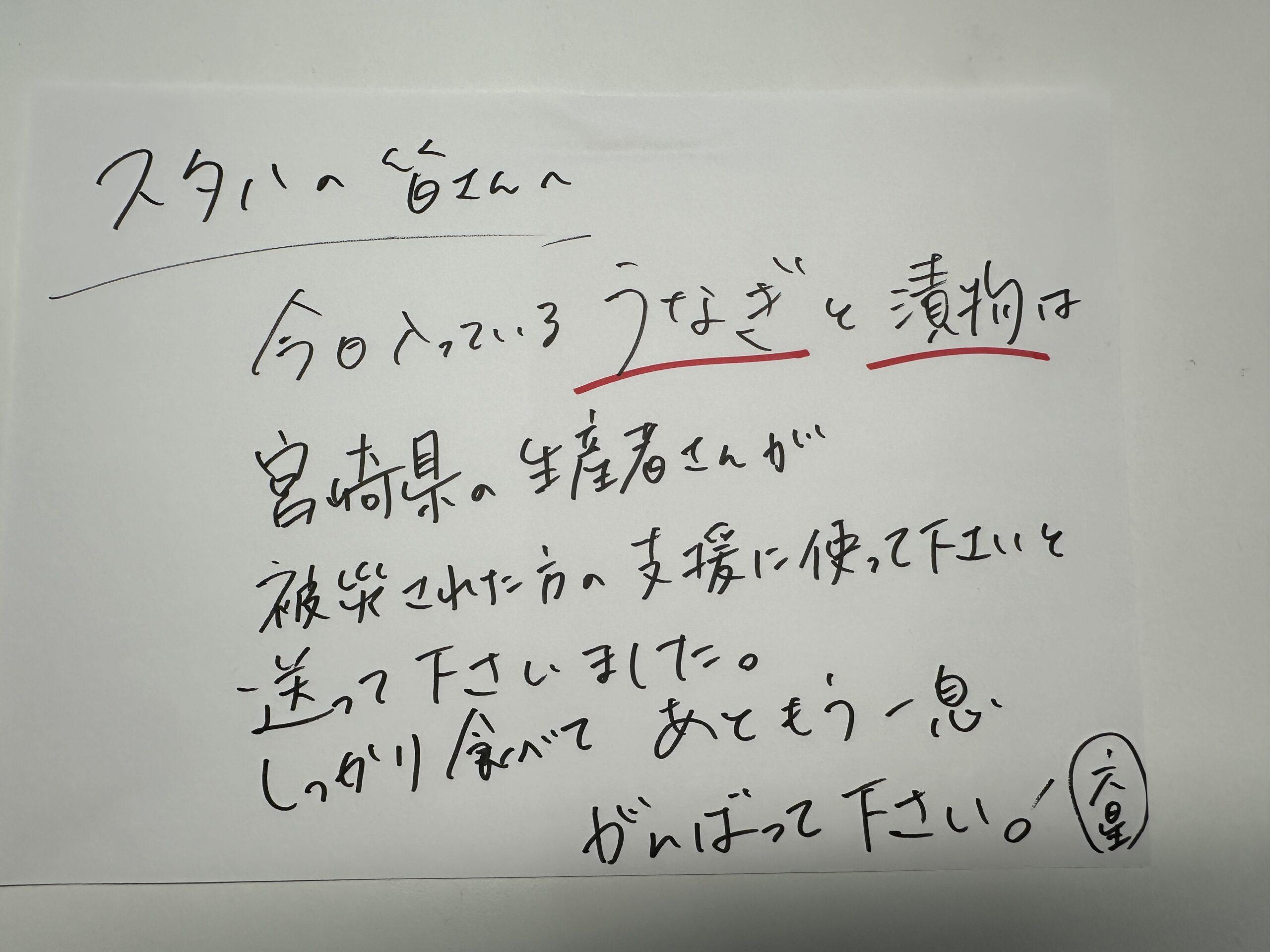 【 「六星」 お昼のお弁当 本当に愛あるお手紙ありがとうございます うなぎが弁当に。。。 宮崎県の生産者様 本当にありがとうございます 大事にいただきました。 みんなのお口に入りました。 感謝です 】コメント (0)