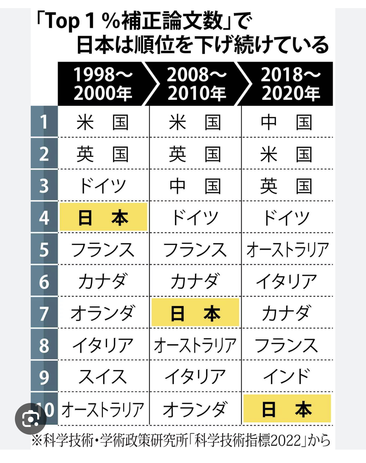 日本の注目論文数は 順位を下げ続けている。 ついに13位に今年なってしまった。 日本の教育力低下を象徴。 私たちの時代の大学の強さは 今の日本の大学にはありません。 ついに イランにも抜かれました。。 …