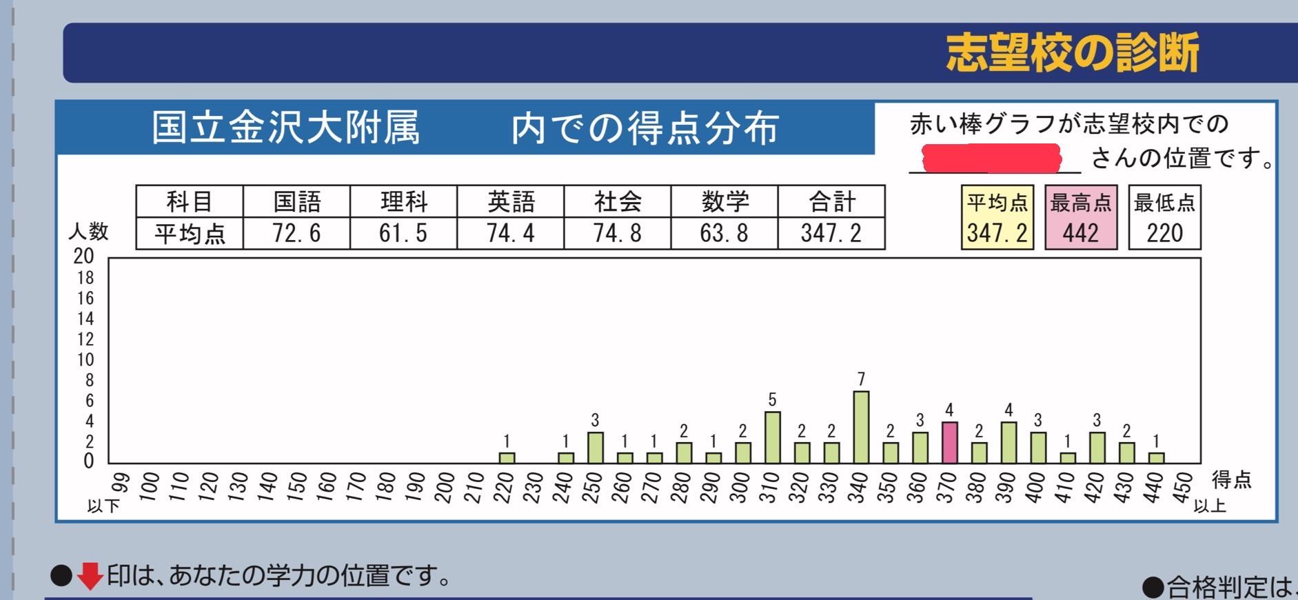 【 速報 】 金大附属高校 得点分布 石川県総合模試 第1回 5教科平均347.2点 スタハ 辰村