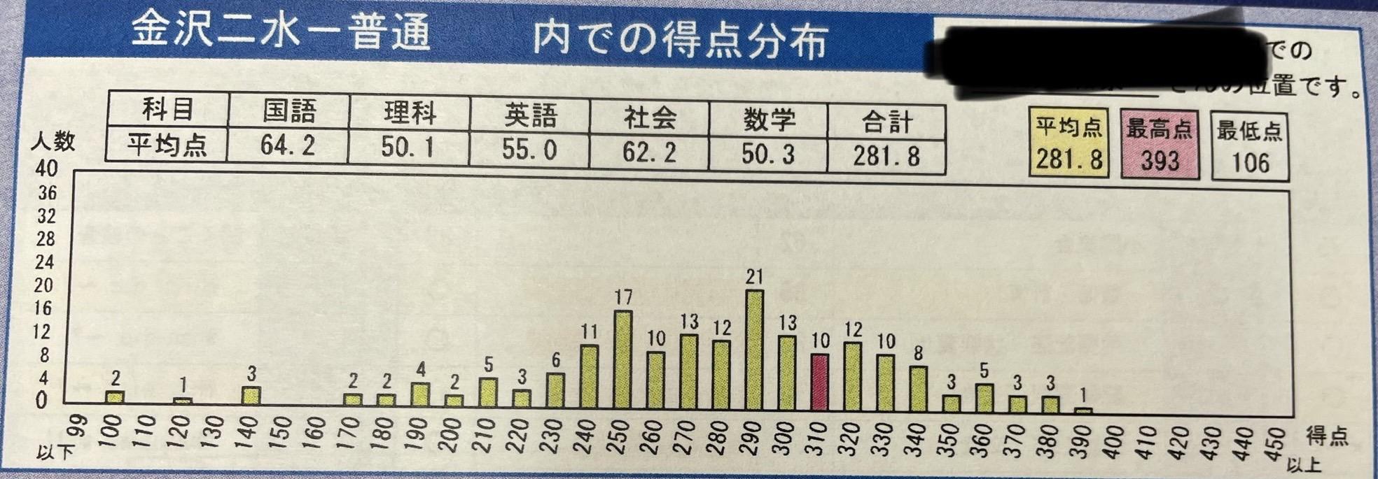 【 速報 】 金沢二水高校 得点分布 石川県総合模試 第1回 5教科平均 281.8点 スタハ 辰村