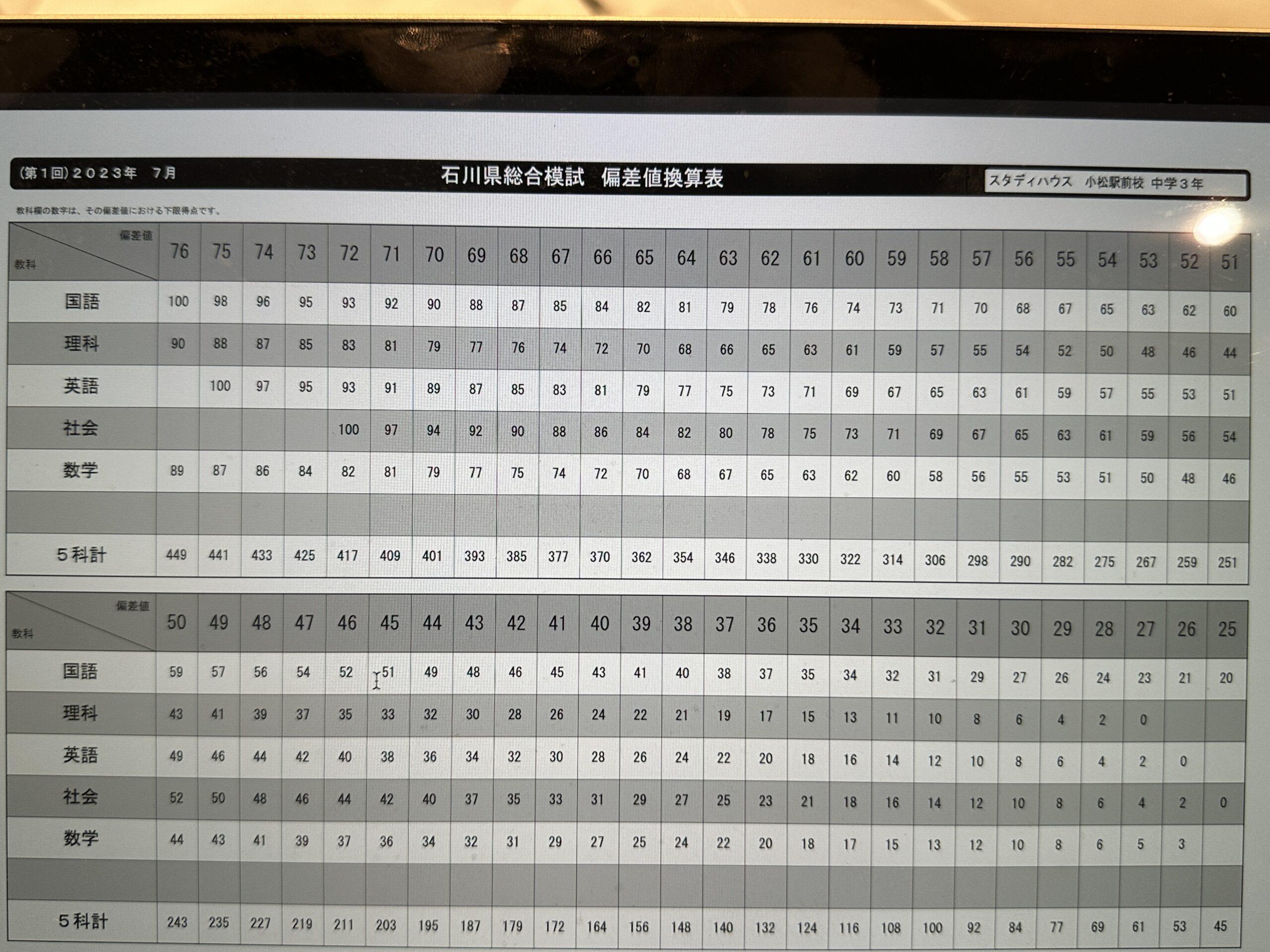 第1回 石川県総合模試 偏差値換算表 スタハ 辰村