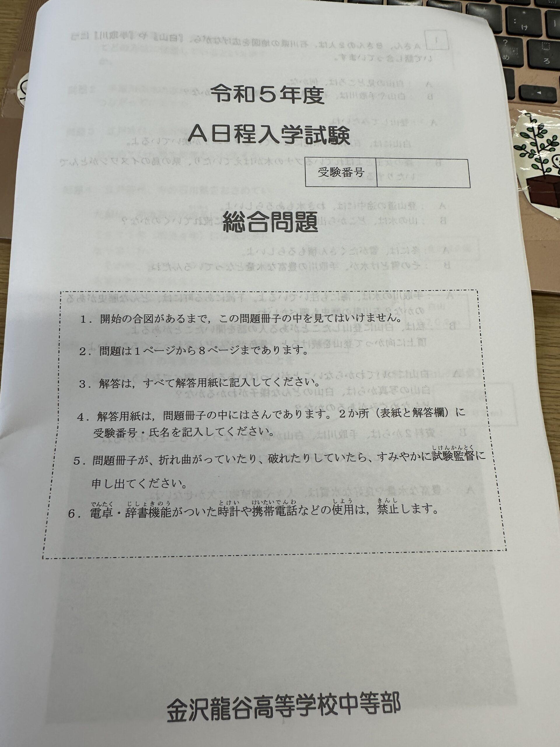金沢龍谷中学の総合問題 基本的な問題。 記述が多いのが好感が持てる。 スタハ 辰村