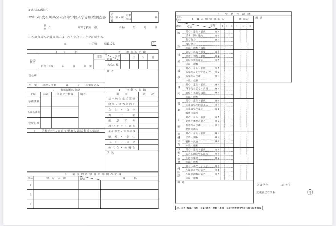中3へ これが 「内申書」です (調査書とも言われる) 石川県公立高校入試の内申書 私立高校や金大附属も類するものです 同じ感じです スタハ 辰村 & …