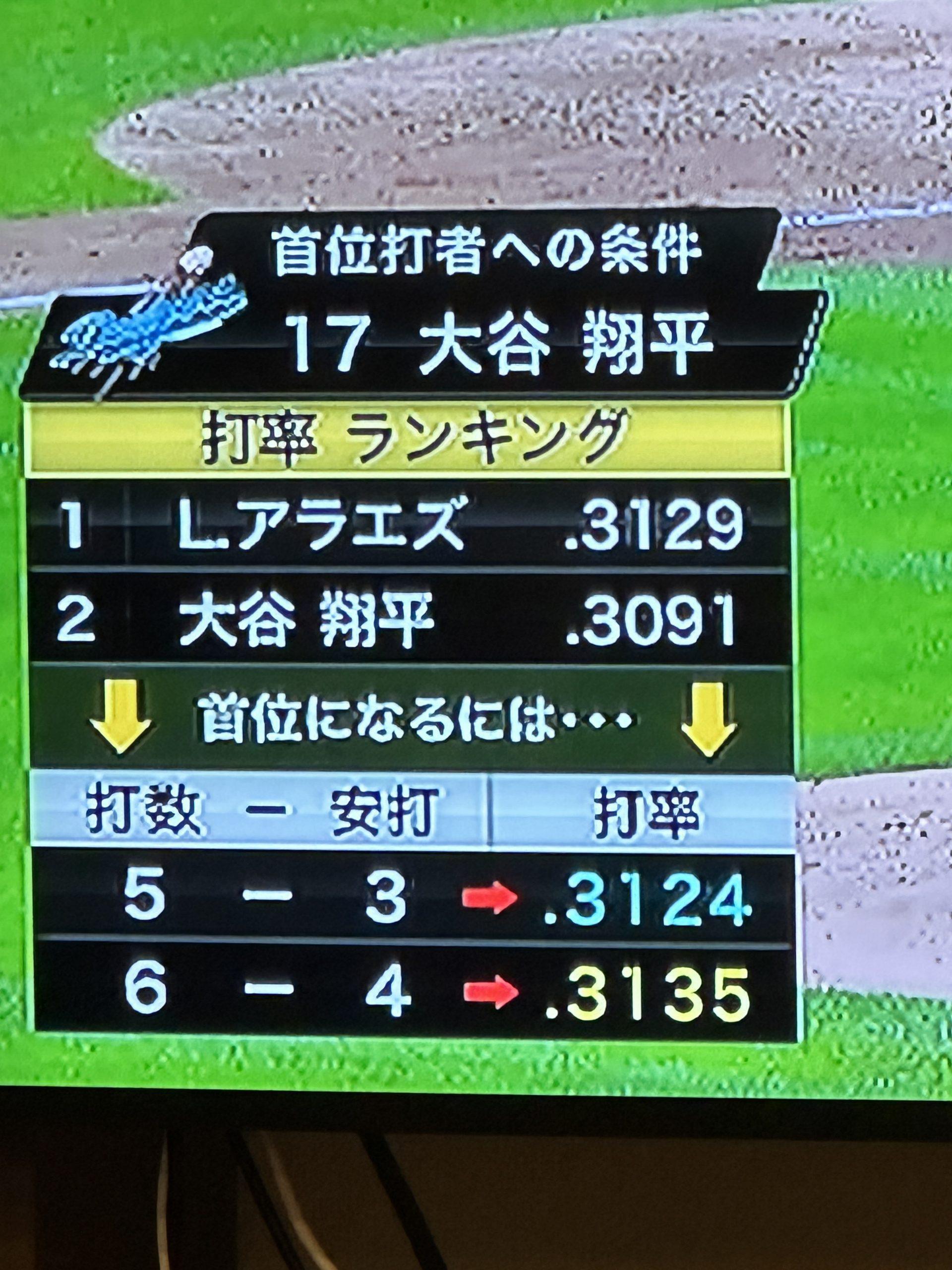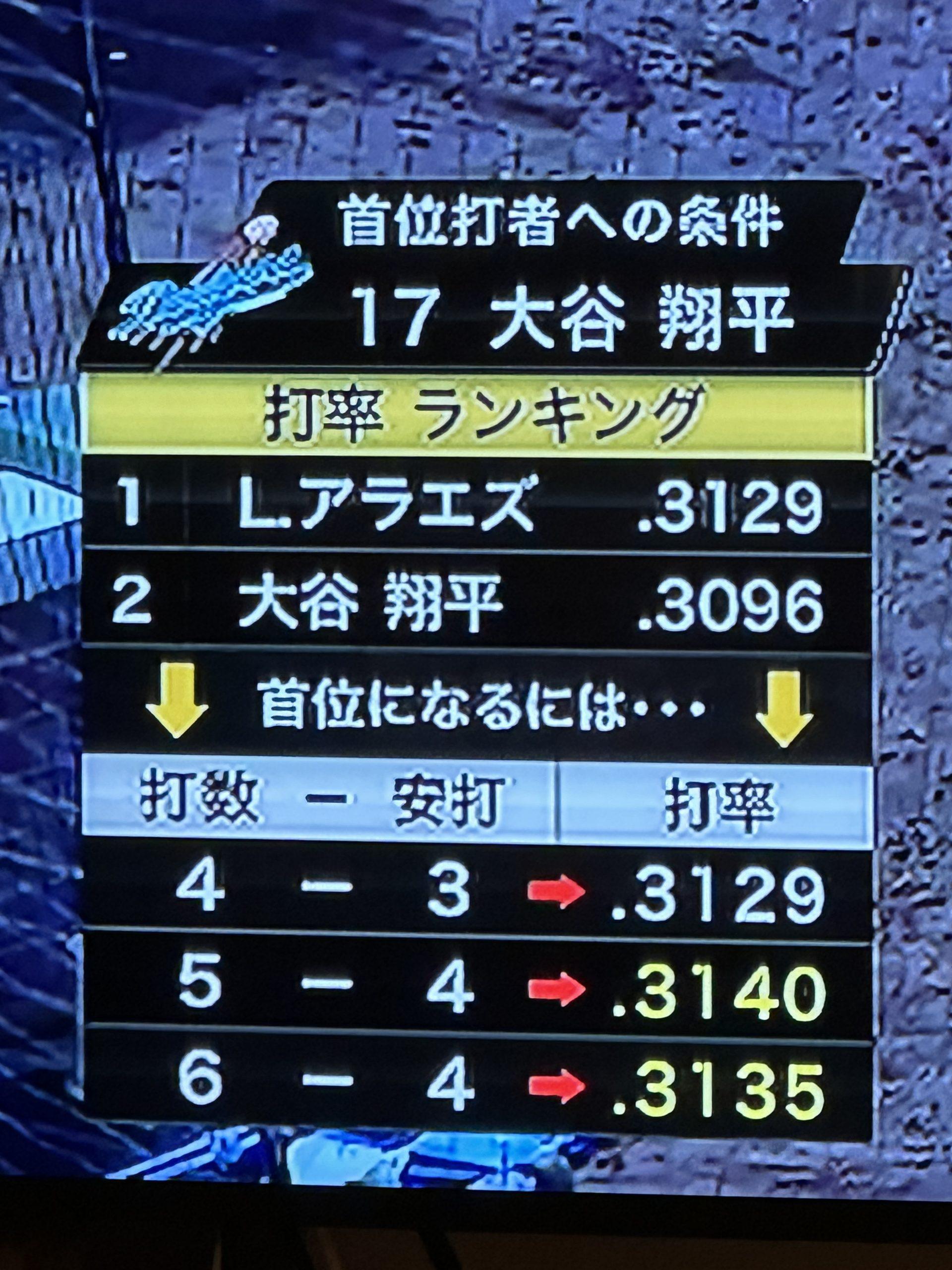 大谷翔平 5時20分現在 打率ランキング アラエズ 大谷 両選手とも2打数0安打 スタハ 辰村