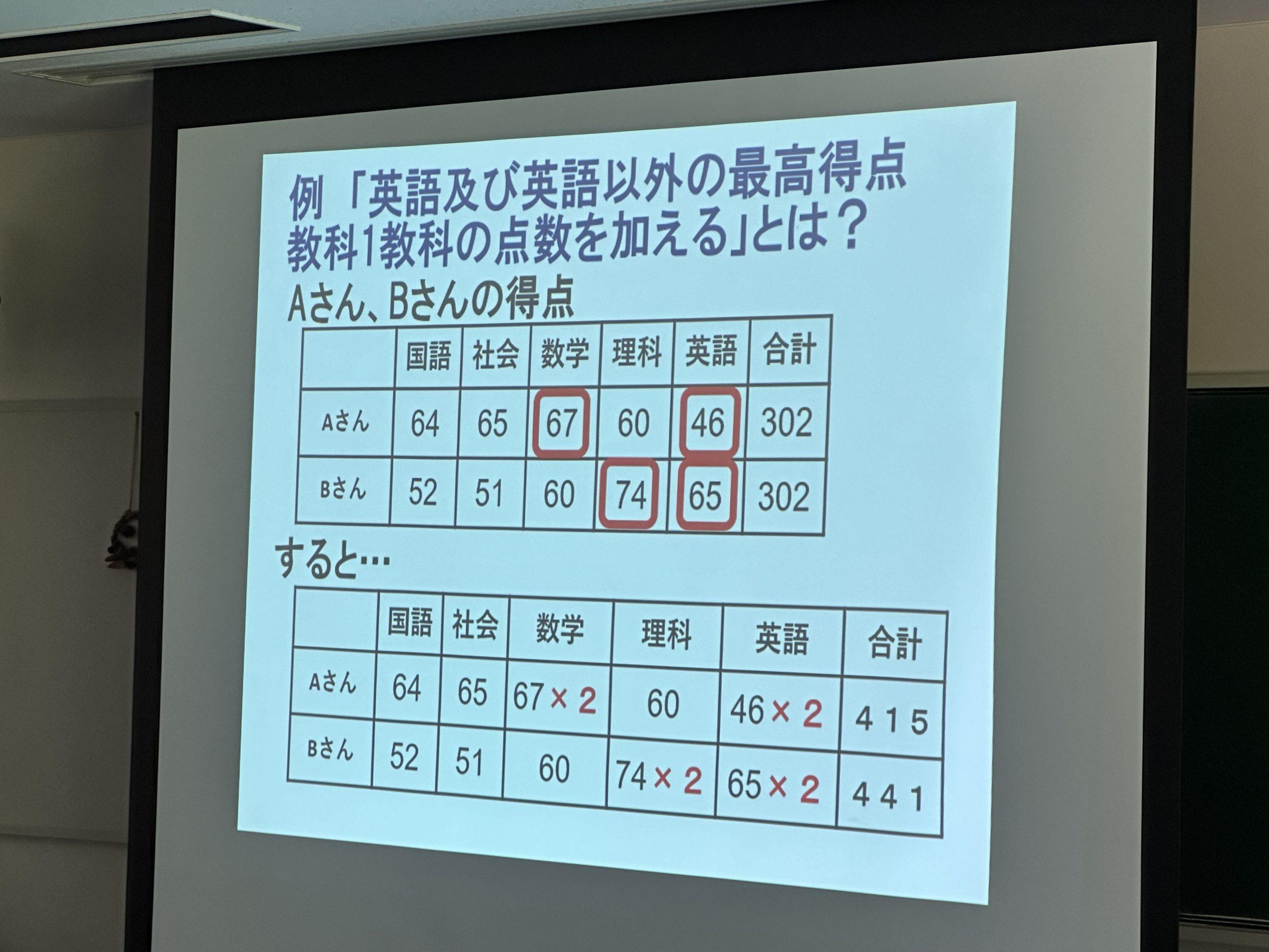 金大附属高校の 最後の10人(110人選んだ後の最後の10人)に対しての選考基準 スタハ 辰村 PS 英語2倍 他の教科の最高得点を2倍 合計 …