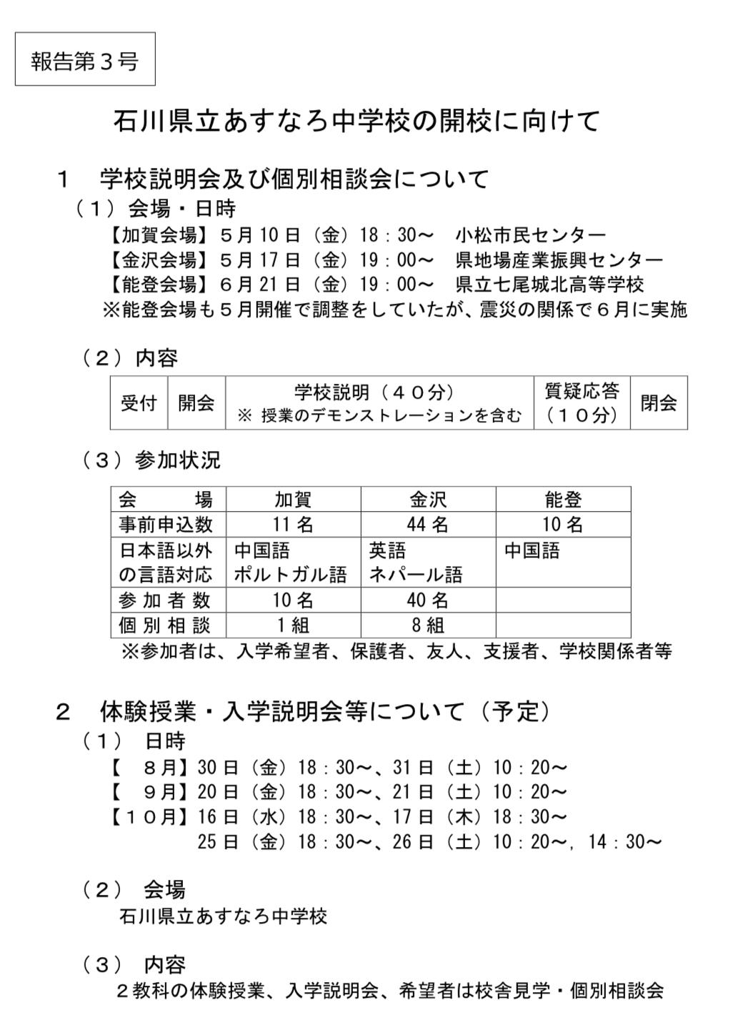 石川県立あすなろ中学校の体験授業 入学説明会 スタハ 辰村 PS 動いていますね 応援しています
