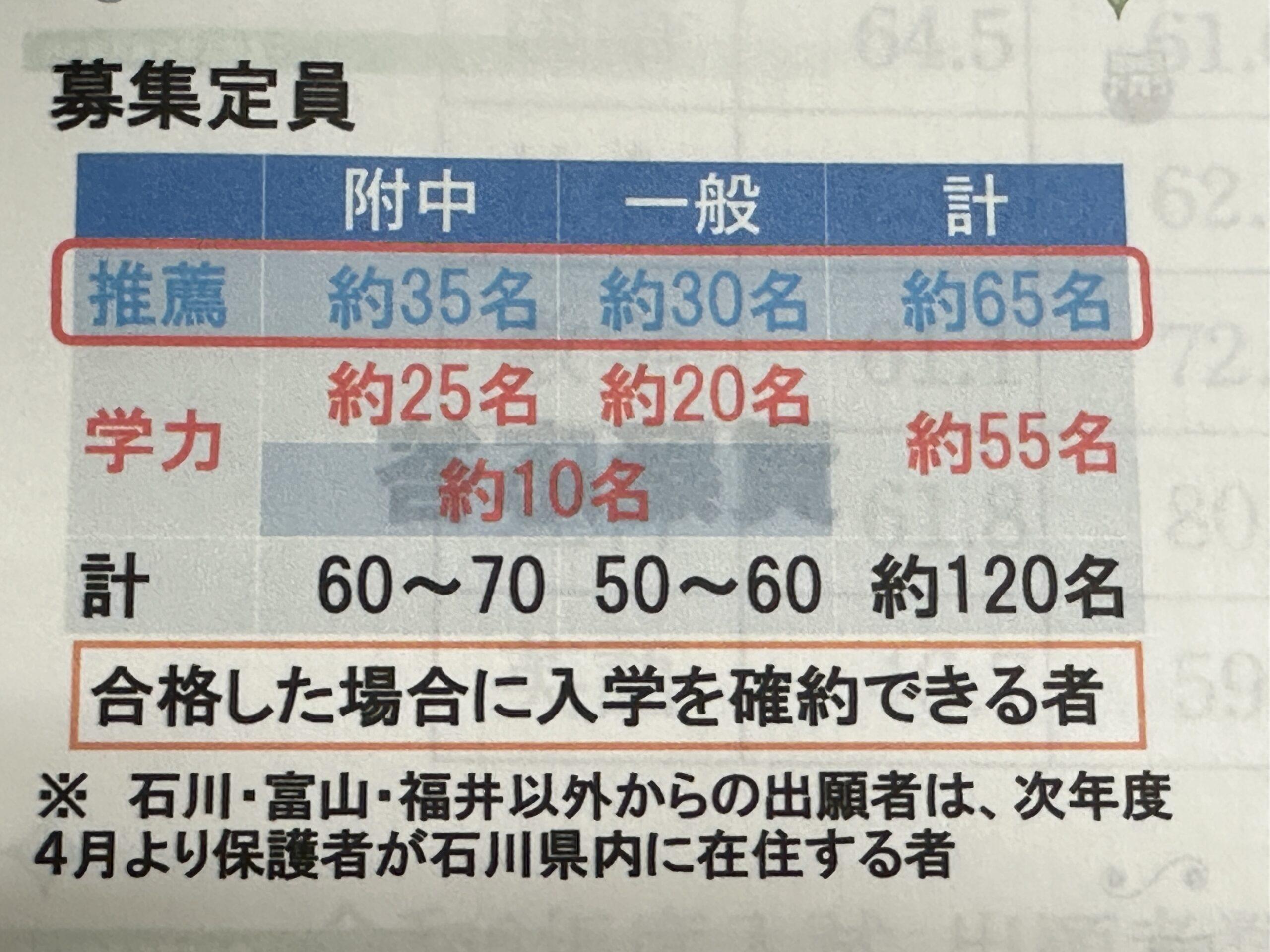 金大附属高校 定員120人中の110人まで 5教科500点 最後の10人 (英語200 さらに強い教科200点 他が100点) 今年は 金大附属中学校出身は 10人 …