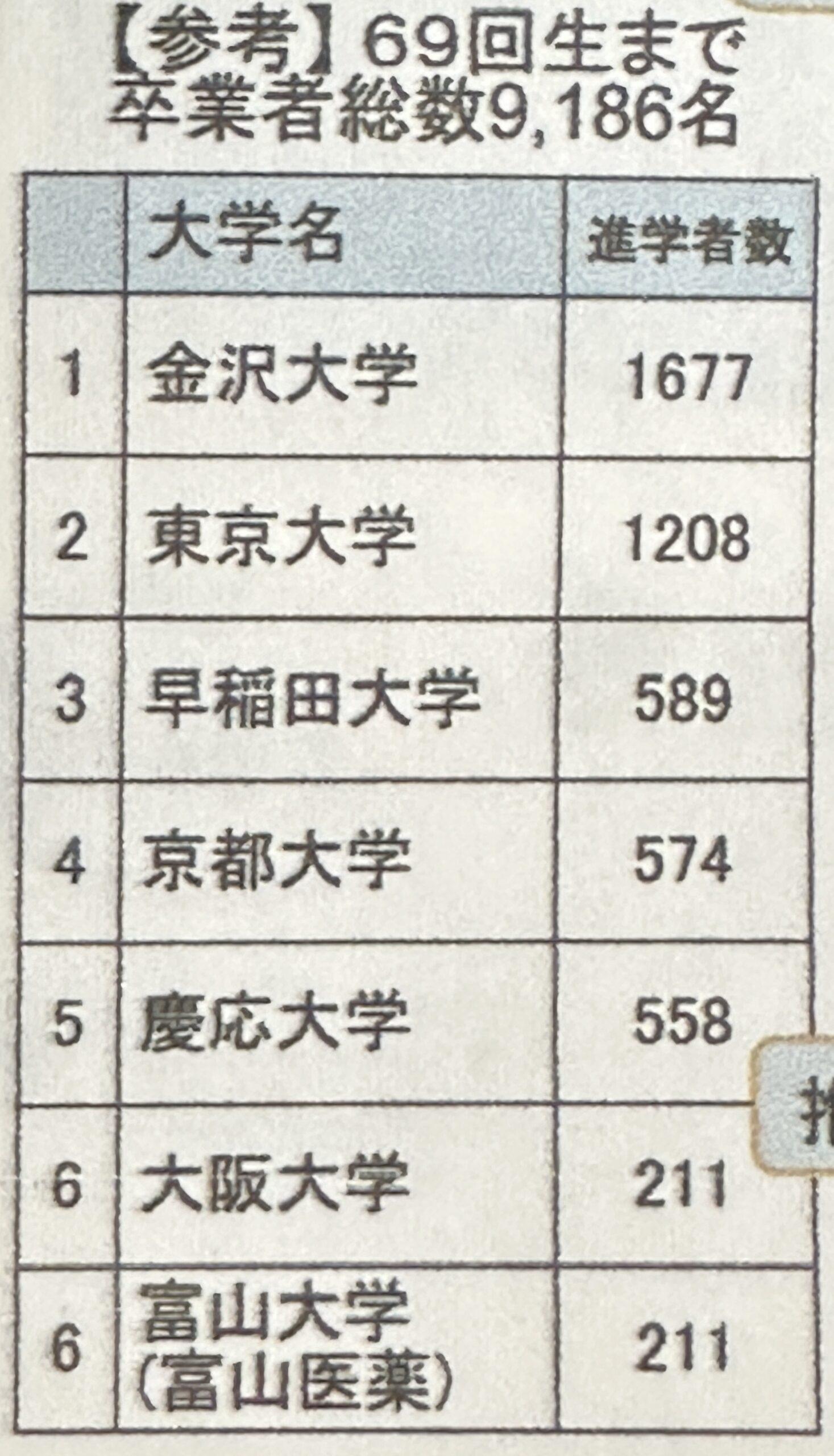 【 金大附属高校 69回生まで 卒業者総数9186名の 進学者数 金大1677 東大1208 早稲田589 京都大学574 】コメント (0)