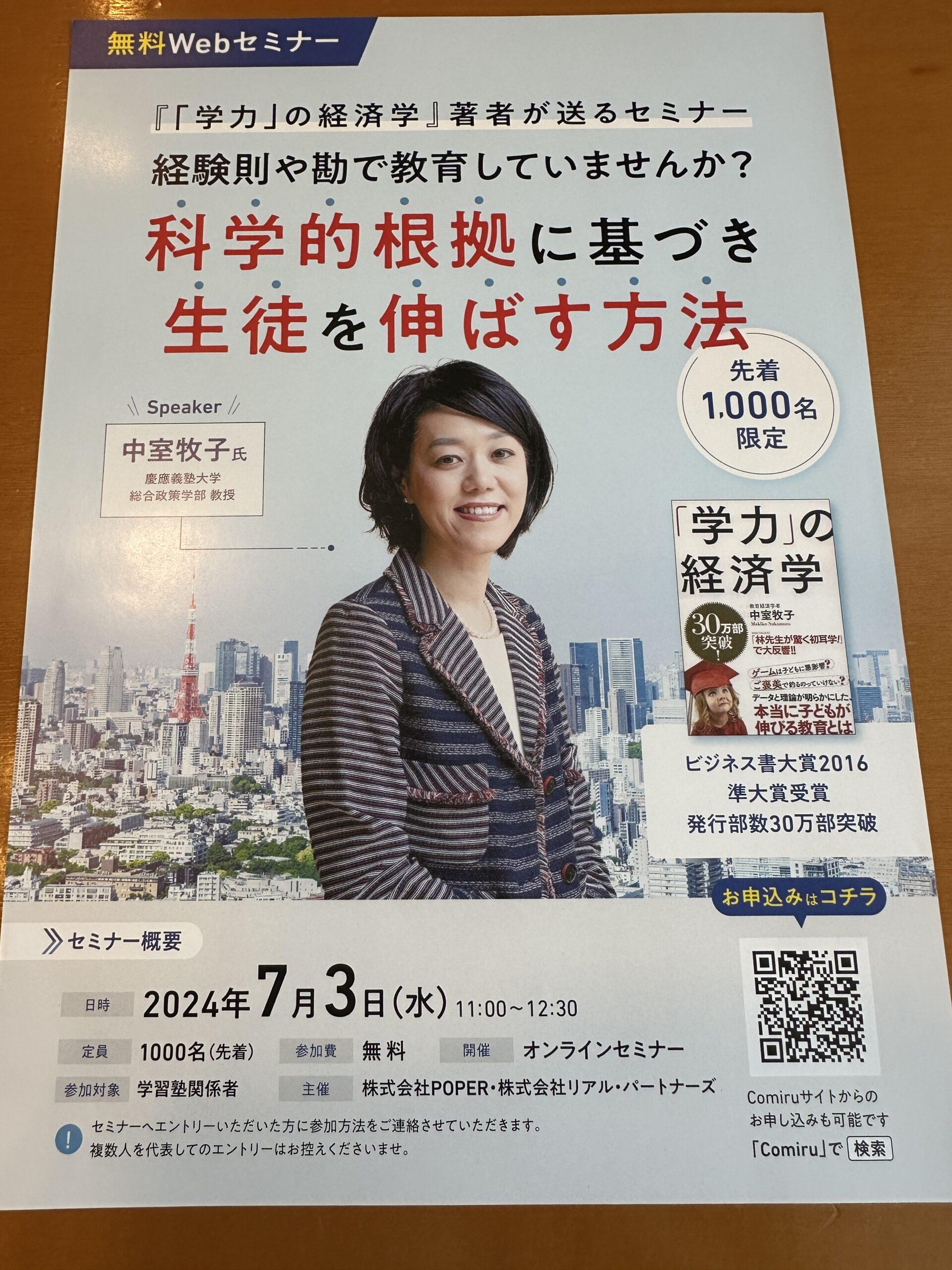 【 学習塾関係者へ 】 このセミナーお勧めだと思います 「学力」の経済学の著者 中室牧子氏(慶應教授) スタハ 辰村 PS 学習塾関係者のみ …